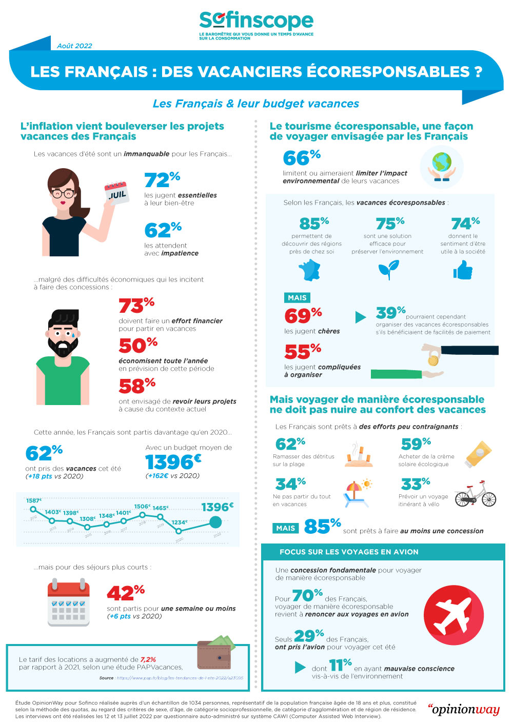 Bien que le budget alloué aux vacances soit en hausse - il progresse de 12% par rapport à 2020 (+162 €) et s’élève désormais à 1 396 €, les difficultés budgétaires succèdent aux restrictions sanitaires et viennent bouleverser les projets de vacances. Pour 73% des Français, partir en vacances représente un effort financier et près de sept Français sur dix estiment que les vacances écoresponsables sont chères. Seulement un français sur dix serait prêt à organiser des vacances écoresponsables quitte à dépenser plus d’argent (12%).